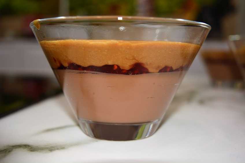 Dejamos que se enfríe el chocolate durante 20 minutos más o menos y cuando haya cuajado, ponemos una capita de mermelada de frabuesa encima.