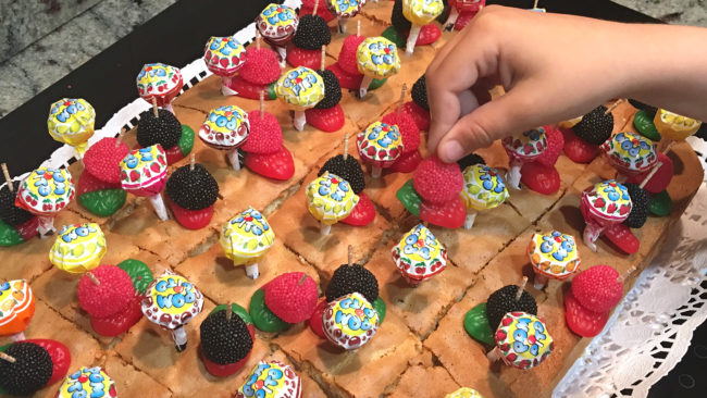 He optado por adornar el bizcocho con golosinas y covertirlo en un bizcocho piñata. Para ello, he usado gominolas y chupa-chups, aunque puedes usar piruletas u otro caramelo con palito porque facilita la labor ;). Pincha con un palillo de madera dos o tres gominolas y clava el palillo en cada una de las porciones. Adorna también con un chupa-chups.