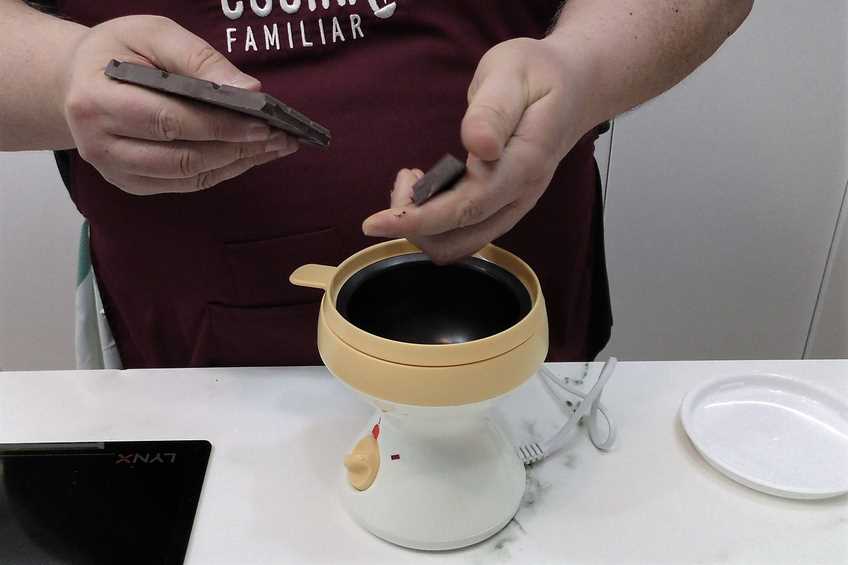 Comenzamos fundiendo el chocolate poniéndolo en un bol troceado y mentiéndolo al microondas durante el tiempo suficiente. El tiempo no es exacto, os recomiendo ponerlo durante 20 segundos e ir mirando para que no se queme. También podéis utilizar una máquina para fondue como la que veis en la foto.
