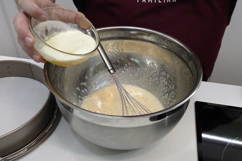 Ahora batimos los huevos junto con el azúcar manualmente y cuando lo estén, agregamos la mantequilla fundida y mezclamos.
