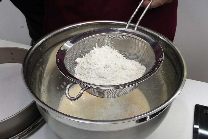 Luego añadimos la harina mezclada con la levadura a través de un colador para que queden tamizadas. A continuación, las mezclaremos con el resto de la masa.