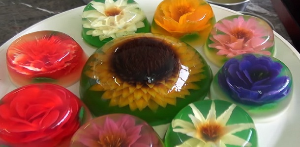 La gelatina permite que en su contenido se utilice una técnica para producir flores y otros diseños en gelatina de colores.