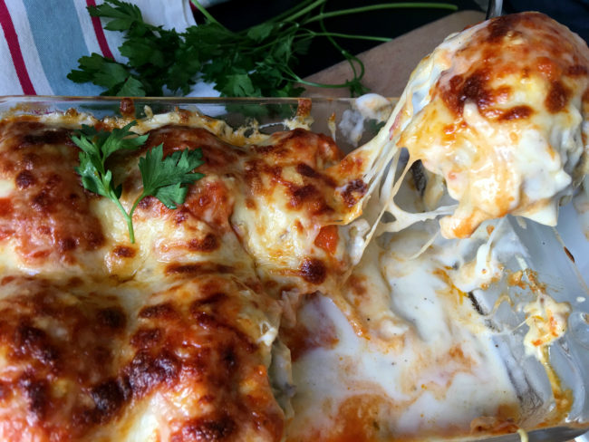 7.- Con una cuchara, ve rellenando todas las claras haciendo montañitas y déjalos en una fuente para horno. Cuando hayas rellenado todos los huevos, es el momento de bañarlos con la bechamel. Tienes que cubrir con bechamel todos los huevos. Añade encima de cada huevo una cucharada de salsa de tomate que le va a dar un color muy bonito al gratinado. Por último, añade el queso rallado. Yo he añadido mozzarella, que funde muy bien, y queso emmental rallado.