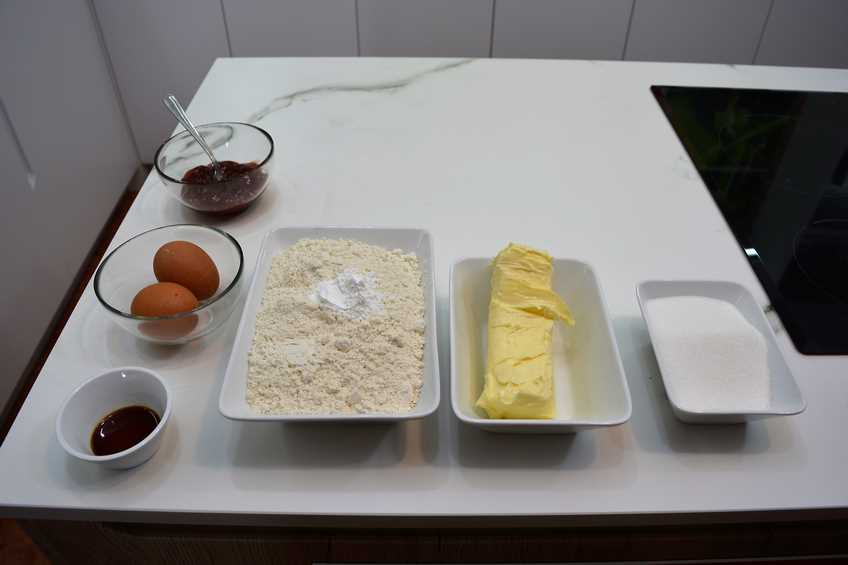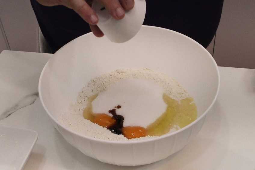 Disponemos todos los ingredientes (excepto la mermelada de fresa, claro) en un bol amplio que nos permita trabajar cómodamente.