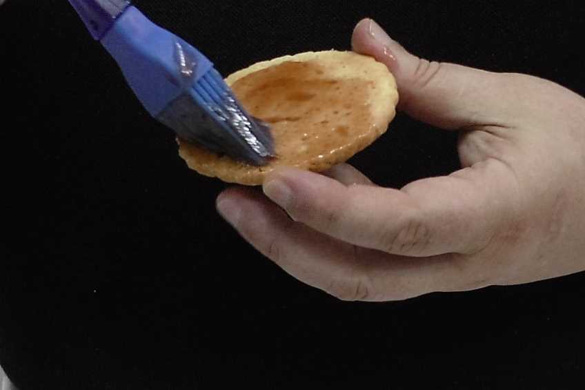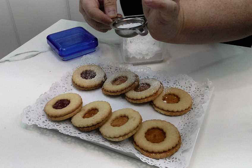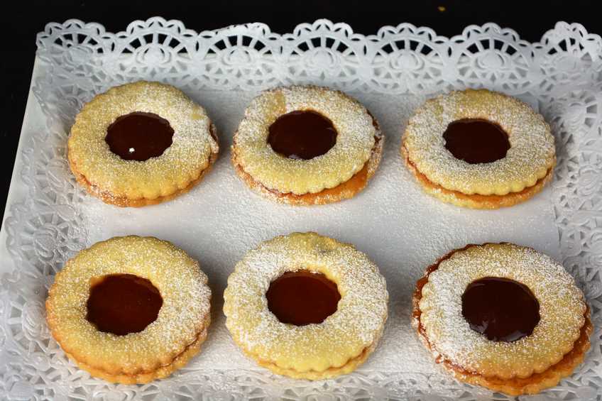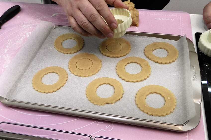 Con las dos partes de las galletas horneadas y frías, es hora de rellenarlas. Pintamos las galletas que no tienen agujero con mermelada y ponemos la parte con agujero encima.
