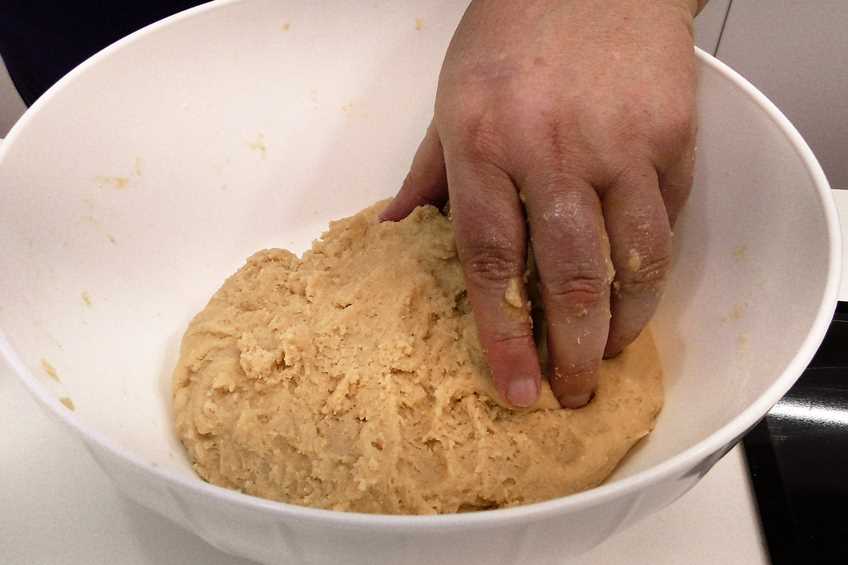 Ahora comenzamos a amasar hasta que tengamos una mezcla que no se nos pegue en las manos. No debe preocuparos que esté blanda ya que irá a la nevera durante unas 2-3 horas para que se endurezca. Tenéis que envolver la masa con papel film antes de meterla a la nevera.