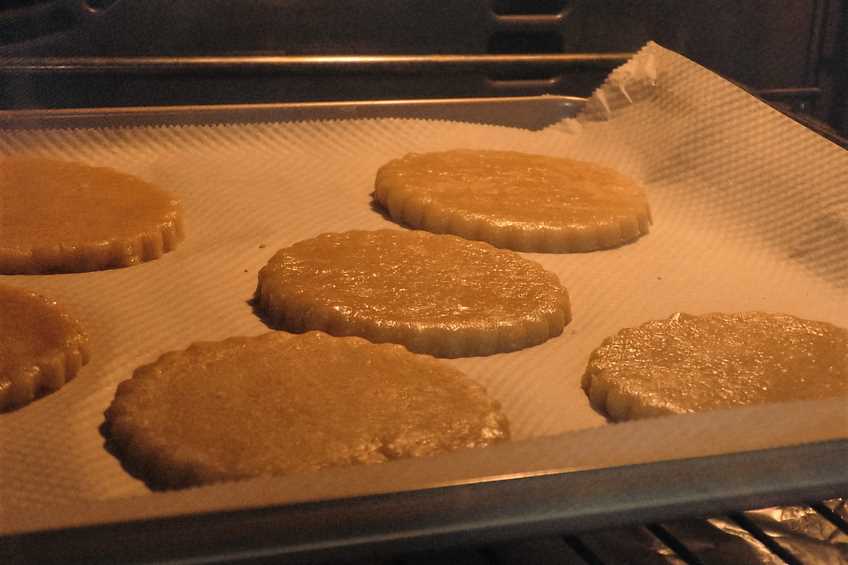 Según vamos cortando las galletas, las colocamos en una bandeja con un papel de horno, así luego no se quedarán pegadas a la bandeja. Encendemos el horno a 180 grados con la temperatura arriba y abajo, y cuando esté caliente metemos la bandeja durante 15 minutos más o menos. Deben estar ligeramente doradas y aunque estén algo blandas, no os preocupéis que al enfriarse se endurecerán y quedarán en su punto.