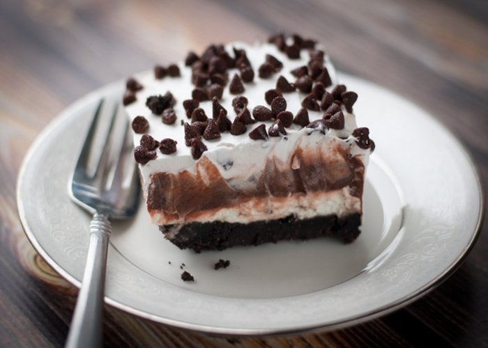 10. Pon la última capa de crema chantilly y alisa. Limpia los bordes y esparce por encima las chispas de chocolate. Deja reposar durante cuatro horas en la nevera o una hora en el refrigerador.