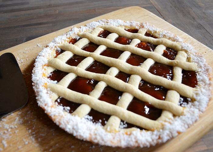 Coloca sobre el membrillo formando un enrejado y pincela las tiras con huevo batido. Lleva a horno moderado durante 40 minutos o hasta que se doren los bordes. Deja que se enfríe y pincela con mermelada los bordes para espolvorear el coco rallado