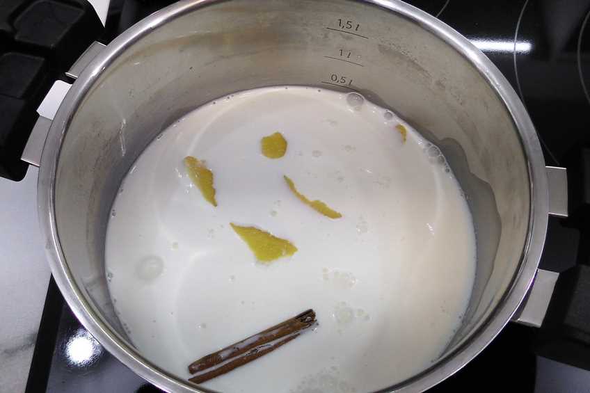 Comenzamos preparando la crema, para lo que pondremos a calentar toda la nata mezclada con la leche (menos un poquito de ambas) junto a un par de trozos de cáscara de limón y un palito de canela en rama. Hay que calentarla a fuego lento y en ningún caso debe llegar a hervir.
