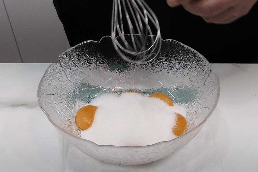 Después de 5 minutos cocinando, retiramos la cazuela del fuego y esperamos a que se enfríe. Luego ponemos las llemas de huevo en un bol junto al azúcar y batimos bien hasta que tengamos una mezcla uniforme.