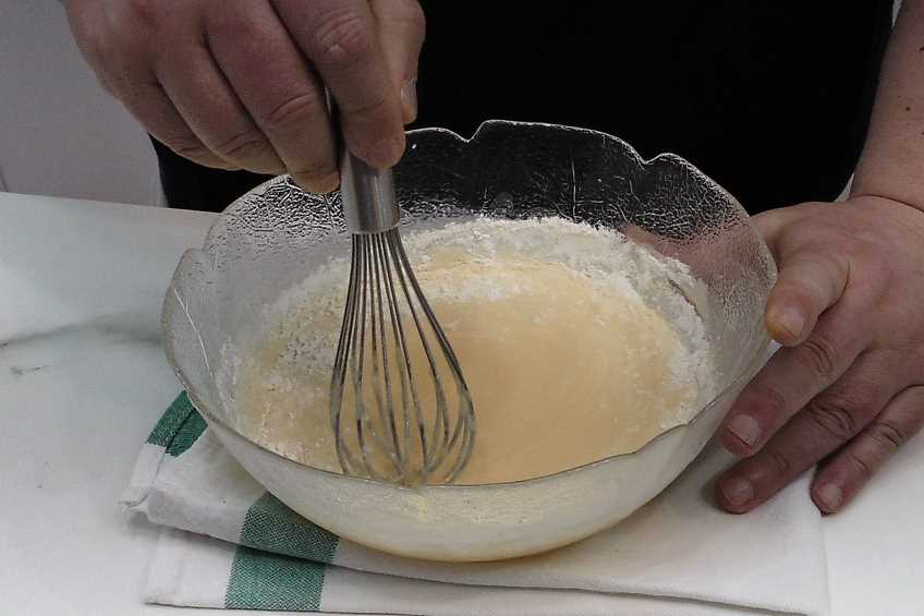 Una vez mezclados, añadimos el poquito de leche y nata que hemos guardado antes, y batimos. A continuación, agregamos la harina y la mezclamos bien con el resto de la crema.
