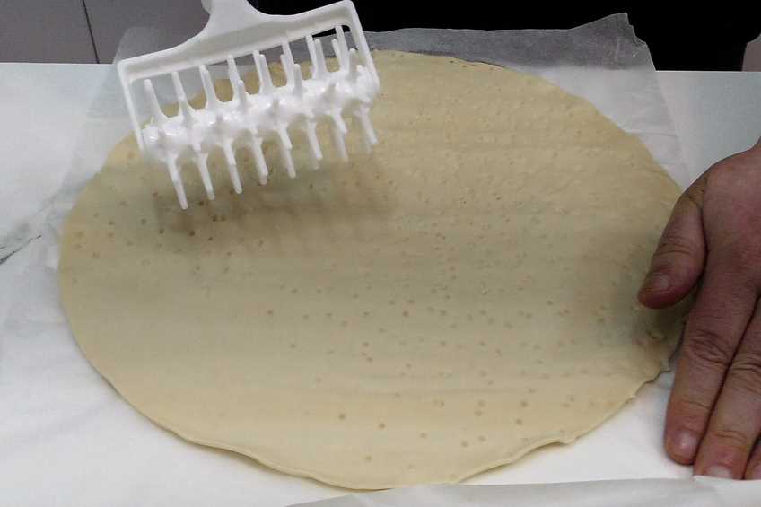 Mientras se sigue enfríando la leche, daremos forma al hojaldre. Extendemos la lámina sobre una superficie plana y le hacemos unos agujeros ya sea con un tenedor o con el rodillo especial para esta labor que tiene Tescoma en su catálogo.