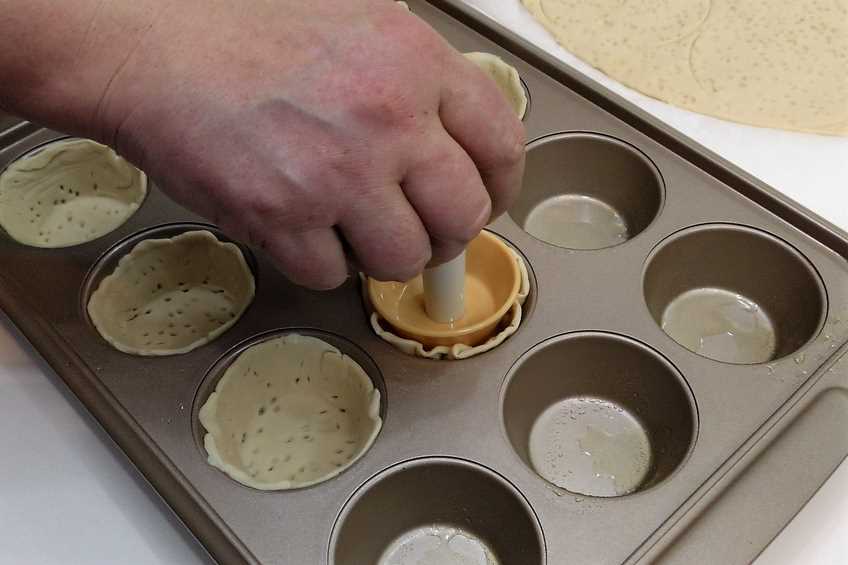 Para darle la forma a las tartaletas, he utilizado un aparato especial pada colocar sin esfuerzo y de la forma más fácil una pequeña lámina redonda de hojalde en el hueco de una bandeja para pasteles. El aparato en cuestión lo podeis ver PULSANDO AQUÍ y me veréis utilizarlo en el video. Primero cortamos el hojaldre con la parte de corta pastas, engrasamos los huecos del molde, colocamos la lámina circular de hojaldre encima de uno de los huecos y presionamos con la pieza alargada.
