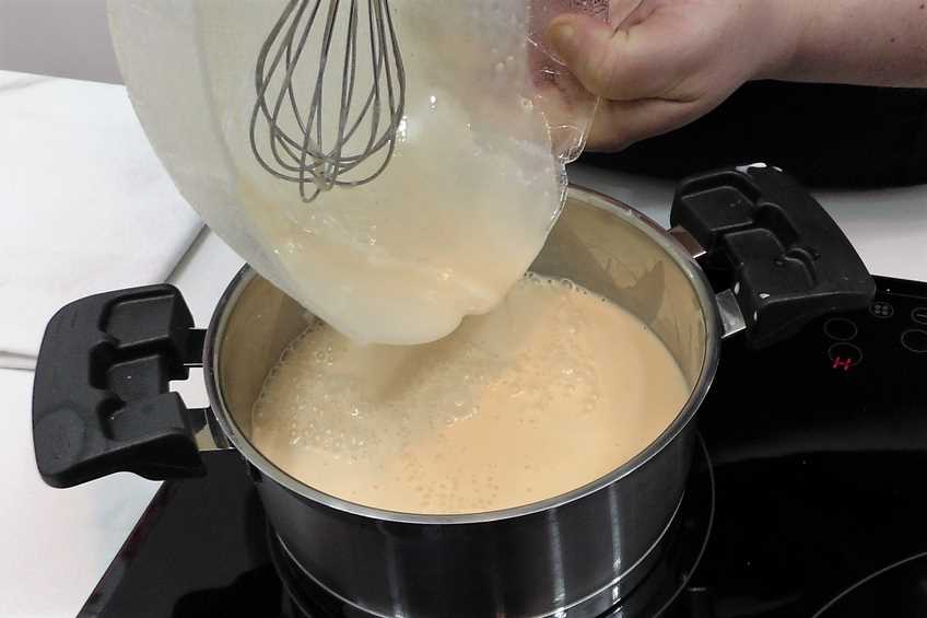Cuando hayamos hecho todos los huecos de la bandeja, terminamos la crema. Volcamos la leche y la nata (habiendo quitado previamente el limón y la canela), mezclamos y luego volvemos a poner todo en la cazuela, donde los calentaremos muy despacio (para que no llegue a hervir).